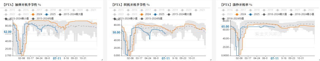 需求端,聚酯负荷至88.8%,7-8月负荷评估89%、88%,长丝后续有减产计划。织造负荷下降较多,终端淡季订单差,夏季高温淡季负荷下降较快,需求走弱中。