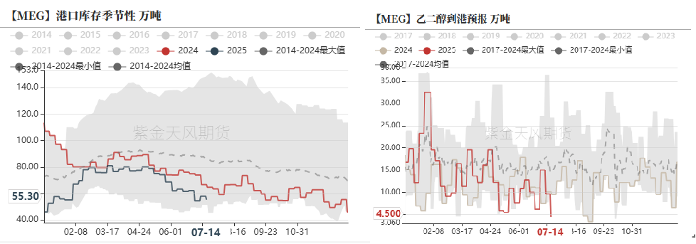 截止7月7日,华东主港地区MEG港口库存约55.3万吨,环比下降2.7万吨。当前库存处于偏低水平。