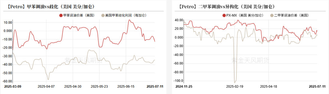 美亚套利价差走扩,甲苯美亚价差238元,二甲苯美亚价差146美元,美对日韩关税预期上调至25%,考虑关税后价差空间不大。
